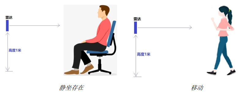 水平安装测试时,安装高度约 1 米,测试静坐存在及走动两种状态下的覆盖范围。