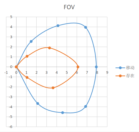 下图展示雷达默认配置下的静止状态(橙色区域) 和运动状态(蓝色区域) 的覆盖范围, 供参考。 用户可直接采用默认模式进行测试。